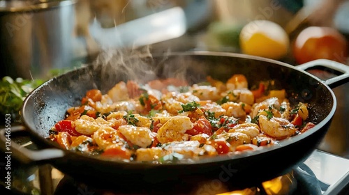 shrimp, frying pan, delicious, vibrant, aroma, culinary, sizzling, vegetable, inviting, cooking, meal, food, favor, skill, dish, epicure, preparation, ingredient, health, creativity, gourmet food, mouth-watering, kitchen, spice, seafood, savoury, rustic, steaming, warmth, enjoyment, comfort, cookery, natural, artistry, colours