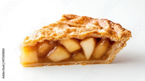Delicious slice of apple pie with a buttery, flaky crust on a clean white background, capturing the essence of a classic dessert