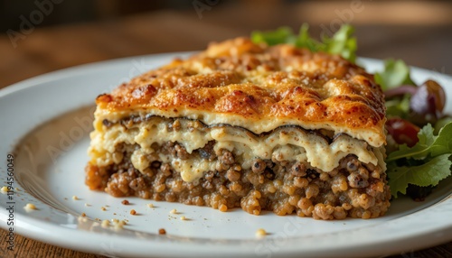 aubergine, ground meat, layered, creamy, crispy, golden brown, fresh vegetable, tomatoes, greener, plate, white plate, appetising, food photography, eatery, meal, dinner, lunch, cookery, delicious, closeup, food, epicure, healthy eating, homemade, traditional, dish, gourmet food, receipe, tasty
