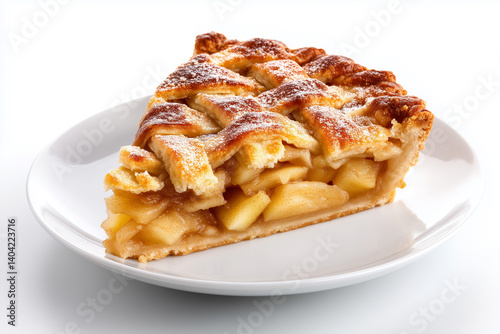 Delicious slice of homemade apple pie resting on a white plate in a bright kitchen setting