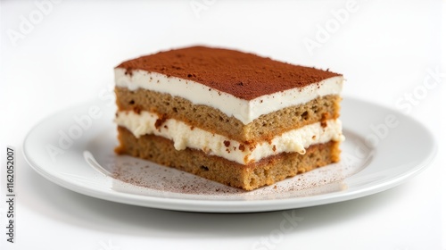 Delicious Slice of Tiramisu on a White Plate in a Studio Shot.