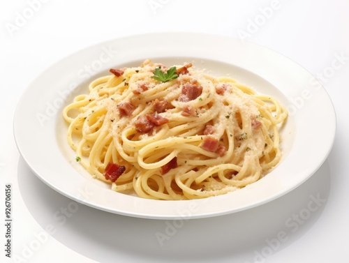 Delicious spaghetti carbonara served on a white plate, garnished with parsley, perfect for Italian cuisine lovers.