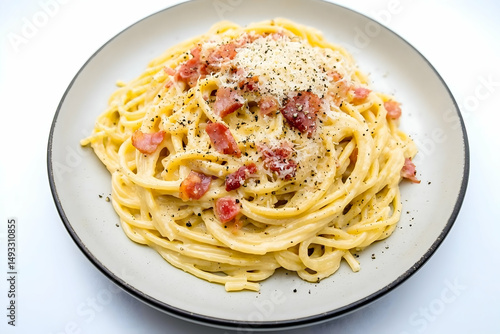 Delicious Spaghetti Carbonara with Bacon Parmesan and Black Pepper Captured in Close Up with Studio Lighting in a Photorealistic 8K Image with a Warm Cinematic Mood