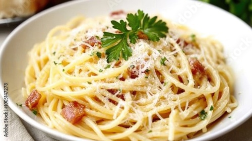 spaghetti, pasta, food, dish, meal, cookery, garnish, cheese, bacon, herb, dining, eatery, plate, culinary, delicious, comfort, italian, fresh, cooking, receipe, eat, nourishment, ingredient, favor, epicure, homemade, savoury, arrangement, side dish, beautiful, bowl, lunch, dinner, elegant, tasty, presentation, warm, traditional, aromatic, bistro, italian cuisine, culinary arts, appetising, wholesome, food photography