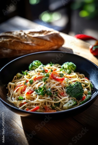 Delicious Spaghetti with Broccoli and Tomatoes, Freshly Prepared and Served in a Dark Bowl on a Wooden Table Surrounded by Artisan Bread