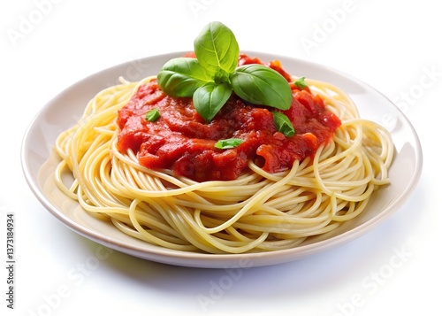 Delicious Spaghetti with Tomato Sauce and Basil on White Background – High-Quality Food Photo, Classic spaghetti with tomato sauce and basil, isolated on white background – perfect for food designs.