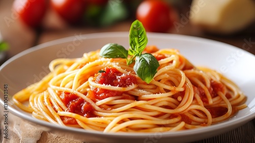 Delicious Spaghetti with Tomato Sauce Basil Garnish Italian Food Pasta Dish Home Cooking Recipe Mediterranean Cuisine Tasty Dinner Plate Red Sauce