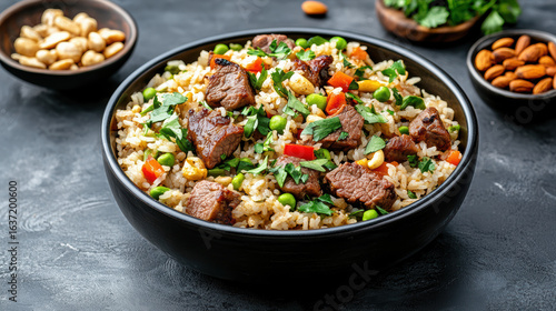 rice, lamb, vegetable, herb, bowl, meal, cookery, spiced, colourful, healthy, ingredient, dining, food, epicure, cooked, savoury, asian, plate, nourishment, receipe, fresh, aromatic, culinary, grain, protein, nut, garnish, favor, dish, feast