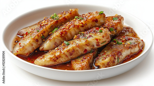 fish, fillet, spicey, chili, sauce, dish, food, cookery, cooking, receipe, seafood, dinner, lunch, meal, tasty, delicious, flavorful, epicure, eatery, plate, bowl, white, red, green, onion, scallion, garlic, ginger, soy, sesame, pepper, hot, heat, protein, healthy, diet, eat, asian, chinese, japanese, korean, thai, crispy, brown, generative, ai