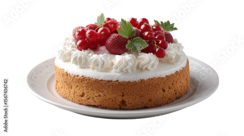 Delicious sponge cake topped with whipped cream and fresh red currants and strawberries isolated on transparent background