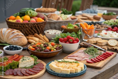 food, gathering, widener, fruit, vegetable, cheese, meat, table, summer, picnic, snack, epicure, healthy, colourful, fresh, bread, herb, party, celebration, salad, dessert, grape, strawberry, cracker, casual attire, platter, charcuterie, family, friends, greenery, dining, relaxing, oneness, favor, community, ceremony, generative, ai