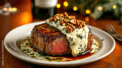 Delicious steak topped with blue cheese crumble and walnuts, served in high-resolution image format.
