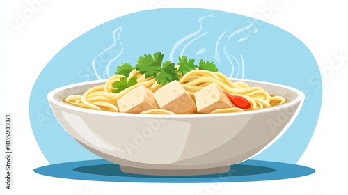 Delicious Steaming Bowl of Noodles with Tofu and Cilantro