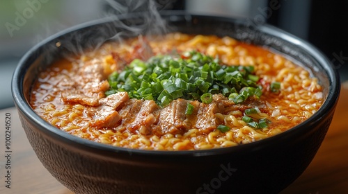Delicious Steaming Bowl of Ramen with Sliced Pork and Green Onions on Wooden Table, Close Up Photo