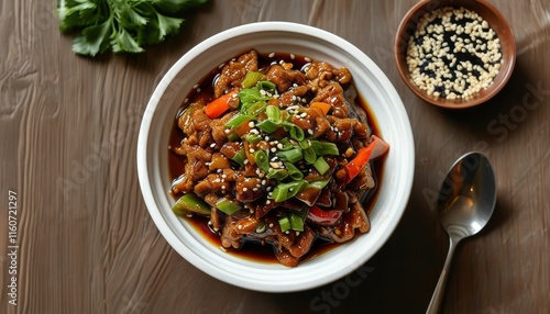 stir, fries, vegetable, savoury, sauce, culinary, korean, dish, healthy, vibrant, fresh, meal, epicure, cook, receipe, preparation, favor, presentation, dining, cookery, organic, seasoning, ingredient, tabletop, garnish, bowl, sesame, green onion, pepper, wooden, background, spoon, natural, colours, topview, delicious, tasty, food, nourishment, wholesome, steaming