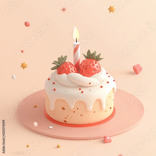 Delicious strawberry cake with candle, 3D render.