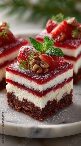 Delicious Strawberry Cheesecake Brownie Squares with Mint and Walnuts