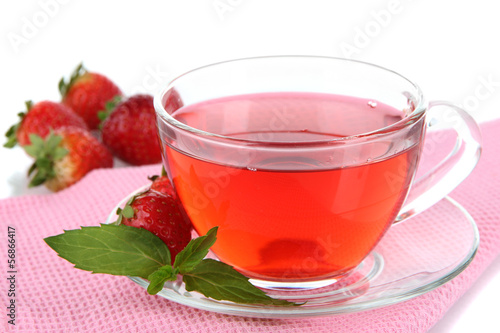 Delicious strawberry tea on table on white background