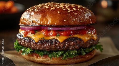 burger, food, eatery, styled, indoor, photo, setting, satisfaction, signature, visual, popular, presentation, dining, juicy, artistic, menu, tempting, comfort, elegant, lettuce, bistro, receipe, delight, tomatoes, enjoyable, indulgence, favor, bite, garnish, exquisite, condiment, snack, delectable, grill, chef, deliciously, onion, sauce, sizzling, sliced, savoury, plate, topping, beef, crafted, tasty, sesame, handcraft, served