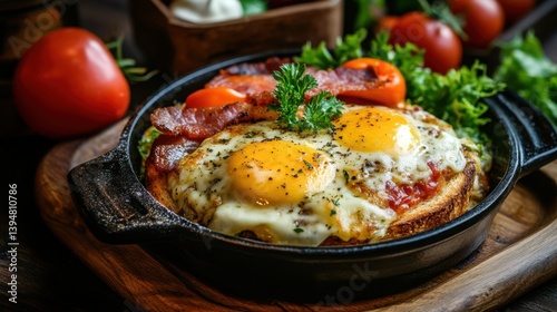 Delicious sunny side up eggs with crispy bacon and fresh herbs on toast served in a rustic skillet breakfast indulgence culinary delight close up shot