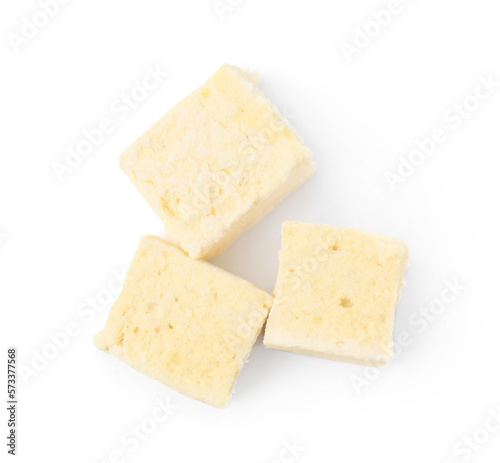 Delicious sweet puffy marshmallows on white background, top view