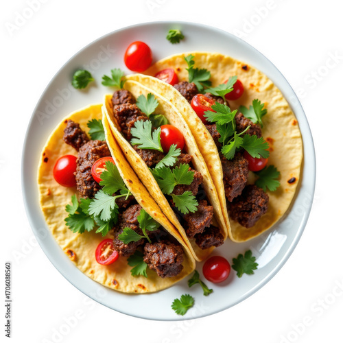 Delicious tacos on a white plate garnished with fresh cilantro and cherry tomatoes