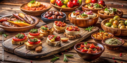 Delicious Tapas Starters on Rustic Wooden Table - Spanish Cuisine Food Photography