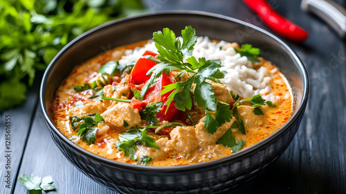 Delicious Thai Curry with Chicken Served with Rice and Fresh Herbs : Generative AI