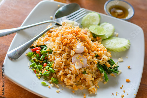 Delicious Thai food. Fried rice with egg, Kale served with minced red and green chilli in white plate on wooden table in cafe and restaurant. Selective focus.