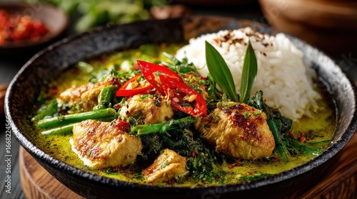 Delicious Thai Green Curry with Chicken, Vegetables and Rice Bowl