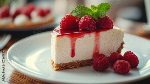 Delicious vanilla cheesecake topped with fresh raspberries and mint, served on white plate. vibrant colors and textures create inviting dessert experience