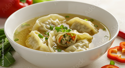 Delicious Vegetable Gyoza Soup Ready to Savor in a White Bowl close up