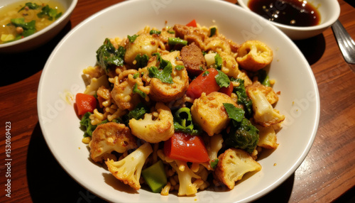 Delicious vegetable stir-fry with noodles in a white bowl