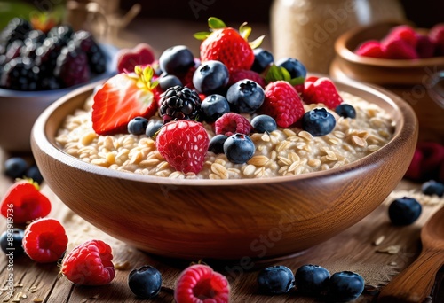 delicious warm oatmeal topped fresh berries nutritious breakfast option, bowl, healthy, fruit, grains, texture, color, organic, sweet, creamy, wholesome, food,