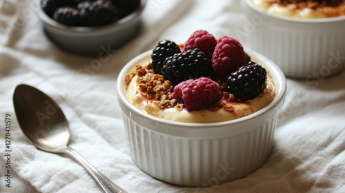 Delicious yogurt topped with granola and fresh berries, creating vibrant and healthy breakfast option. Perfect for nutritious start to day