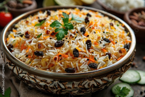 Deliciously aromatic vegetable biryani served in a decorative bowl with fresh herbs and spices