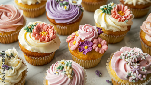 Deliciously Decorated Cupcakes with Colorful Frosting and Flowers