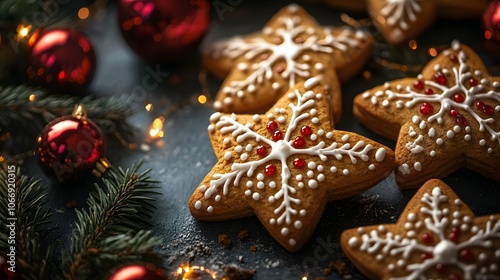 Deliciously decorated star-shaped cookies with festive ornaments and pine branches.
