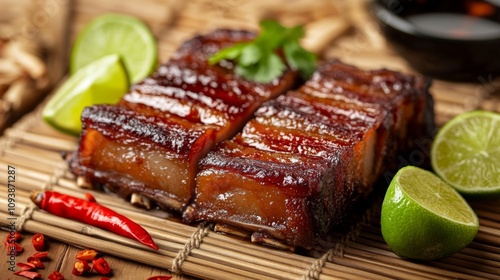 Deliciously Glazed Pork Belly on Bamboo Mat with Lime Wedges and Red Chili Peppers, Perfect for Asian Cuisine and Food Photography