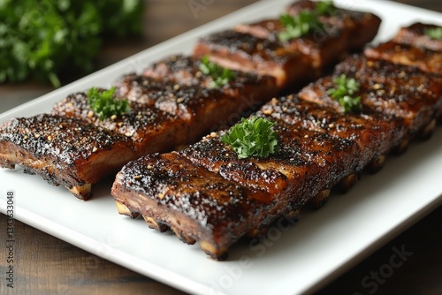 Deliciously grilled barbecue ribs served on a white platter with fresh herbs, showcasing a mouthwatering dining experience