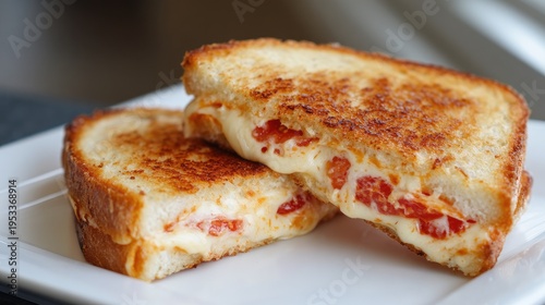 Deliciously Grilled Cheese Sandwich with Melted Cheese and Tomato Slices on Toasted Bread Served on a White Plate in Bright Natural Light