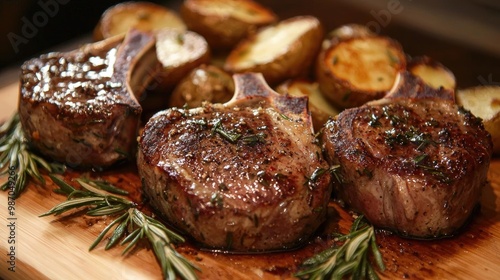 Deliciously grilled lamb chops garnished with herbs, served with golden roasted potatoes on a wooden board.