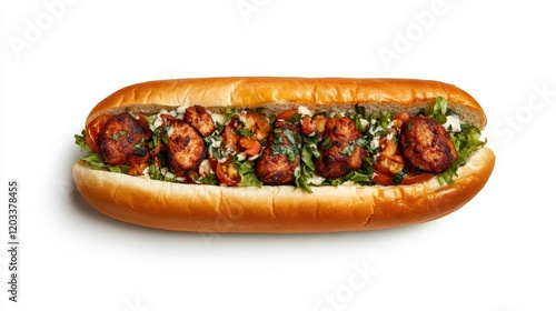 Deliciously Grilled Meat Sandwich with Fresh Vegetables and Spices Served in a Crisp Hot Dog Bun for a Flavorful Culinary Experience