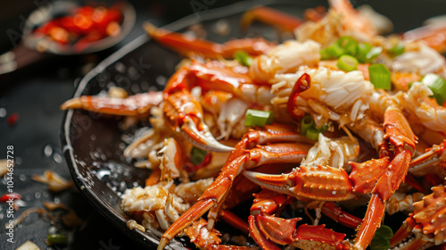 Deliciously prepared crab dish garnished with green onions and spices, showcasing vibrant colors and textures that evoke sense of culinary delight