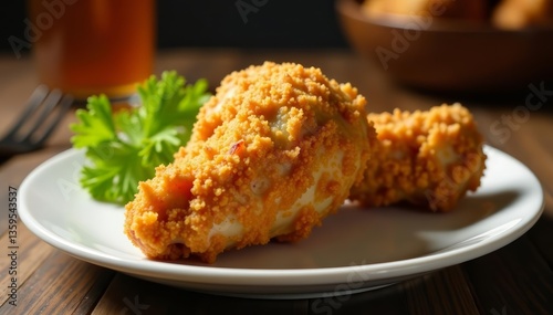 Deliciously seasoned fried chicken leg with a crunchy coating on a plate, delicious, fast food, golden brown