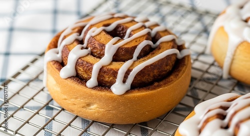 Deliciously sweet sticky bun with white icing drizzled in a classic swirl pattern on a cooling rack, perfect for a morning treat