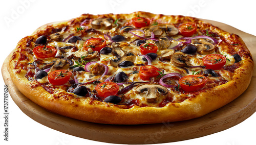 Deliciously topped vegetarian pizza with cherry tomatoes and olives isolated on transparent background