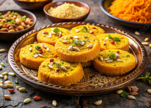 Deliciously vibrant, this plate features traditional Indian ghevar, sweet delicacy garnished with nuts and herbs, perfect for festive occasions