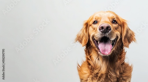 delighted dog with its tongue out, sitting against a white background, emphasizing its cheerful and lively personality.