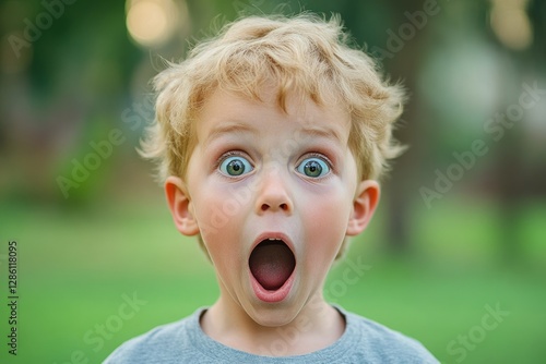 Delighted Youngster. Charming Portrait of a Surprised Blonde Boy Against a Vibrant Green Park Background